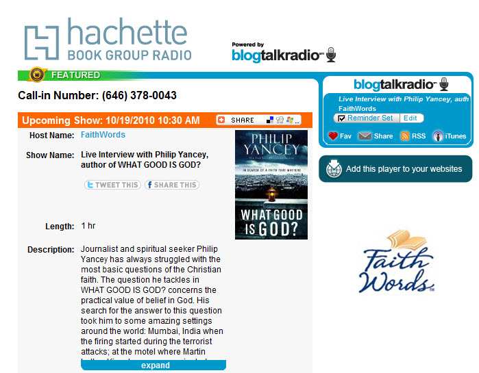 A live interview with Philip Yancey about his new book, What Good Is God? is scheduled for the Hachette Book Group Radio channel on BlogTalkRadio on Tuesday, October 19 at 1:30 p.m. Eastern Standard Time.